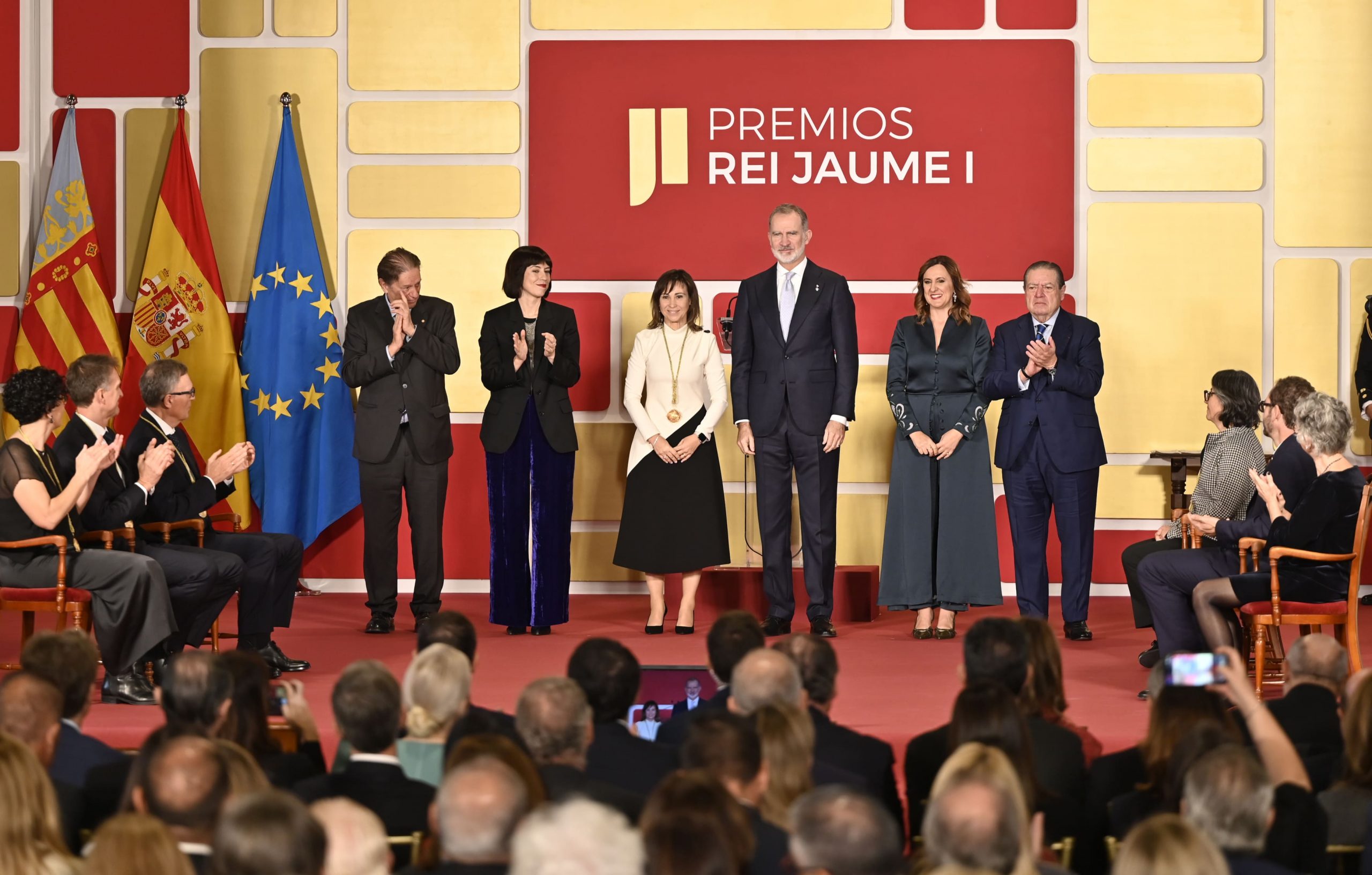 Felipe VI ha hecho entrega de los premios Rei Jaume I a los galardonados de este año: José Luis Mascareñas (Investigación Básica); Jan Eeckhout (Economía); Nuria López-Bigas (Investigación Biomédica); Victoria Reyes (Protección Medio Ambiente); María Jesús Vicent (Nuevas Tecnologías); Damià Tormo (Revelación Empresarial); y Silvia de Sanjosé (Investigación Clínica y Salud Pública).