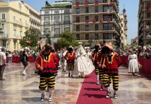 La imagen procesional de la Virgen de los Desamparados ha llegado en su “maremóvil” hasta la Plaza de Toros. La Geperudeta ha entrado en el coso taurino, el publico en pie, ha aplaudido con una gran ovación. Después miembros de los Seguidores de la Virgen la han llevado en andas hasta el escenario donde ha sido colocada.