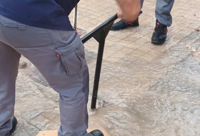 Con la ayuda de la Policía Local acordonan la zona para evitar resbalones de los viandantes. También garantizan la circulación de los vehículos de la zona. Requieren a trabajadores de Aguas de Valencia para realizar el corte en la red de suministro. Actualmente ya no hay fuga de agua en la zona.