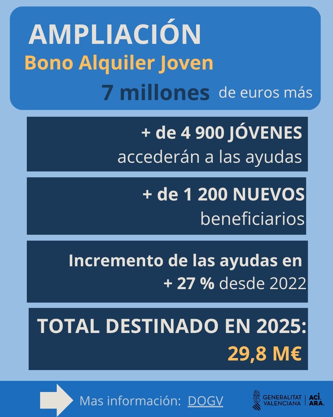 La Generalitat Valenciana, a través de la Vicepresidencia Primera y Conselleria de Servicios Sociales, Igualdad y Vivienda, ha aprobado una ampliación de crédito de siete millones de euros destinada a reforzar la convocatoria del Bono Alquiler Joven 2025. Esta inyección económica eleva la dotación total de la ayuda hasta los 29,8 millones de euros, y permitirá que más de 4.900 jóvenes puedan beneficiarse de esta subvención para el pago del alquiler.