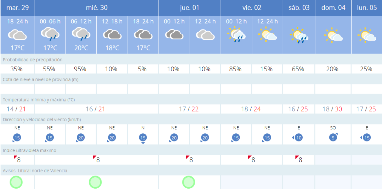 Intervalos nubosos por la mañana y poco nuboso o despejado durante la tarde, con una probabilidad de precipitación del 20%. Un ascenso generalizado de las temperaturas, con mínimas de 18º y máximas propias de los meses de verano, alcanzando los 30º en la ciudad de Valencia.