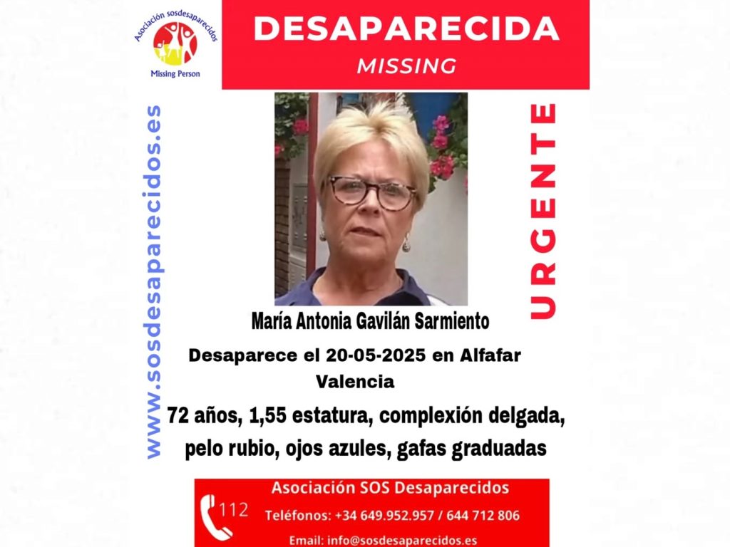 Gran operativo de búsqueda de una mujer de 72 años en Alfafar. Se trata de María Antonia Gavilán Sarmiento, está desaparecida desde el 20 de mayo. La asociación SOS Desaparecidos ha activado una alerta para localizarla. Fue vista por última vez el martes en las inmediaciones del cementerio de Alfafar. Desde entonces, se ha desplegado un operativo de búsqueda en el que han participado los bomberos del Ayuntamiento de Valencia, recorriendo diversas zonas de difícil acceso y con abundante maleza, sin resultados positivos hasta el momento.