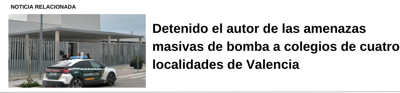 Esta mañana la Guardia Civil de Valencia ha detenido a un joven de 24 años de Paterna por enviar correos electrónicos amenazantes a varios colegios de la provincia de Valencia. Estas amenazas han provocado la evacuación y suspensión de clases en diversas localidades, aunque las autoridades no han encontrado artefactos peligrosos en los centros educativos.