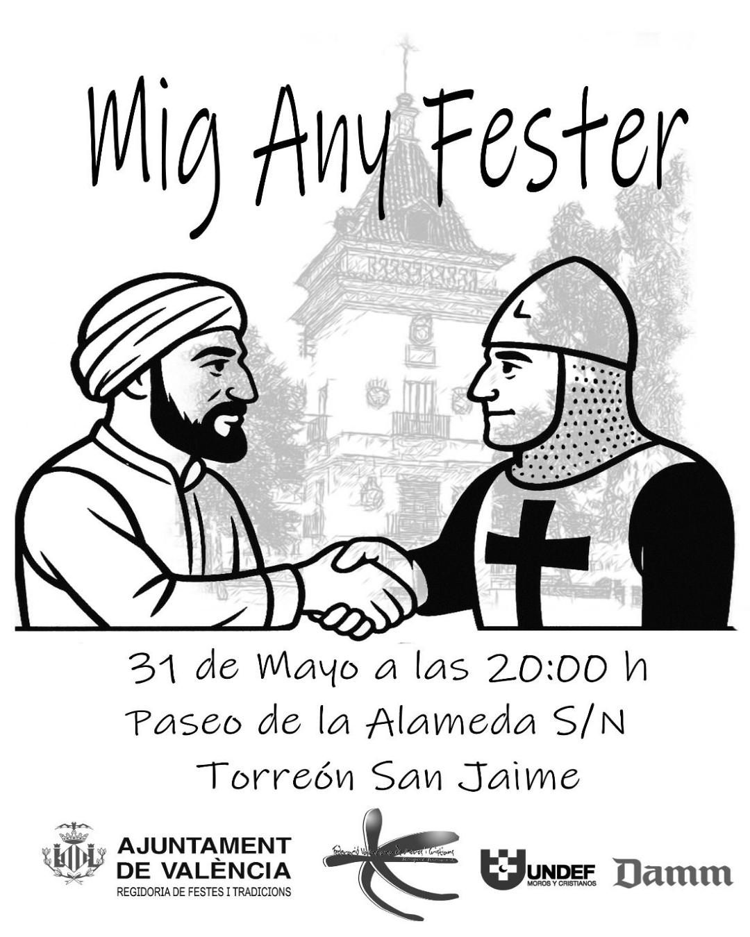 Con el Torreón de San Jaime y los jardines del Paseo de la Alameda como escenario, la Federación Valenciana de Moros y Cristianos (FeVaMic) reunirá a centenares de festeros para conmemorar el ecuador del ciclo festivo con una jornada de convivencia. El Mig Any de Moros y Cristianos se celebra este 31 de mayo en Valencia. Esta jornada es antesala de uno de los momentos más esperados del calendario festivo de la ciudad.