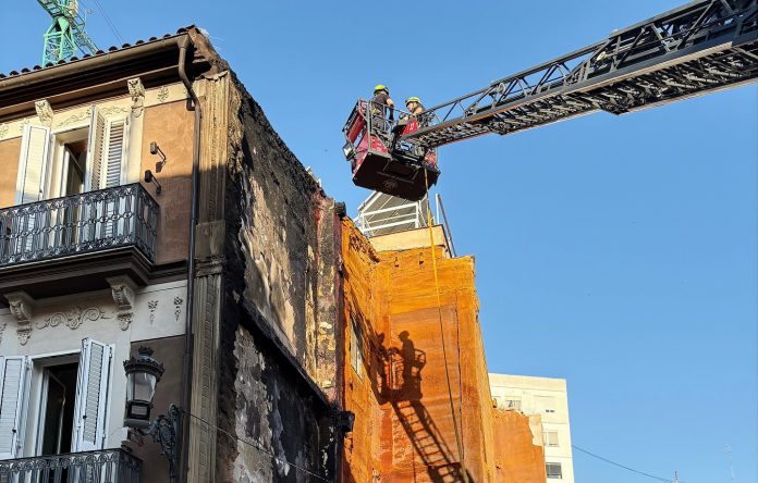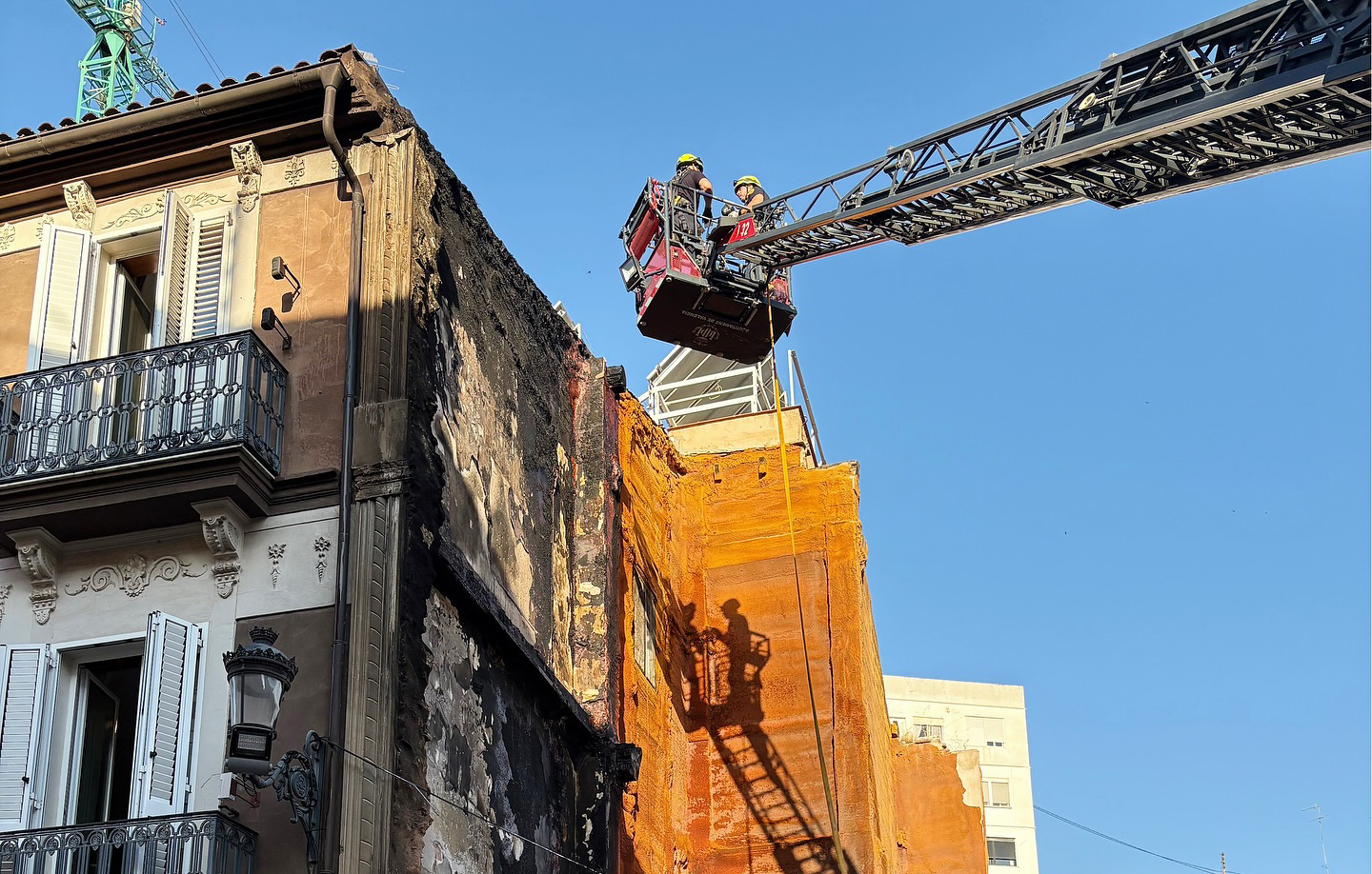 Los bomberos actúan con el vehículo de altura sobre los focos activos en la parte superior de la fachada. Enfrían y extinguen las vigas afectadas hasta eliminar cualquier riesgo de que se reavive la llama.