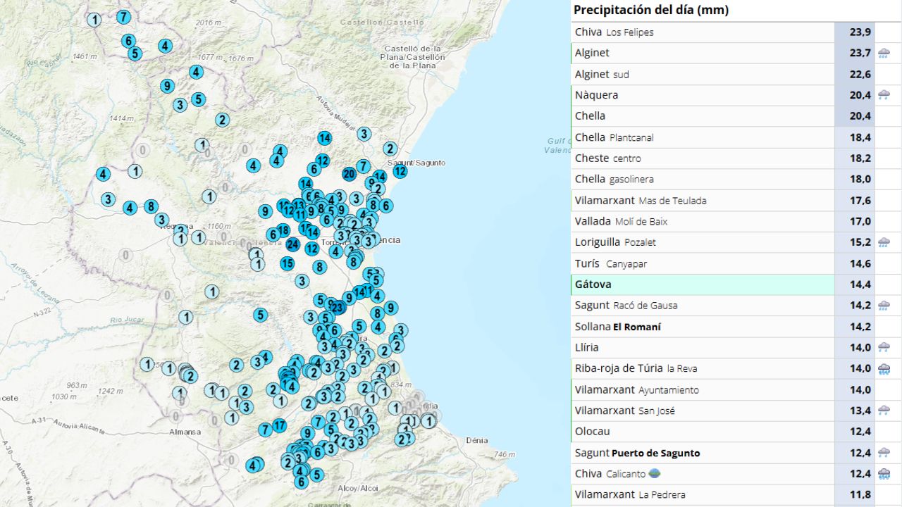 Los datos registrados en la jornada de hoy muestran un núcleo tormentoso en la zona del Camp de Túria, con intensas lluvias en Náquera (20,4 mm), Vilamarxant (17,6 mm) y Gátova (14,4 mm). Además, la comarca de la Hoya de Buñol y la Ribera Alta, también han vivido fuertes precipitaciones en localidades como Chiva (23,9 mm), Cheste (18,4 mm), Turís (14,6 mm) y Alginet (23,7 mm).