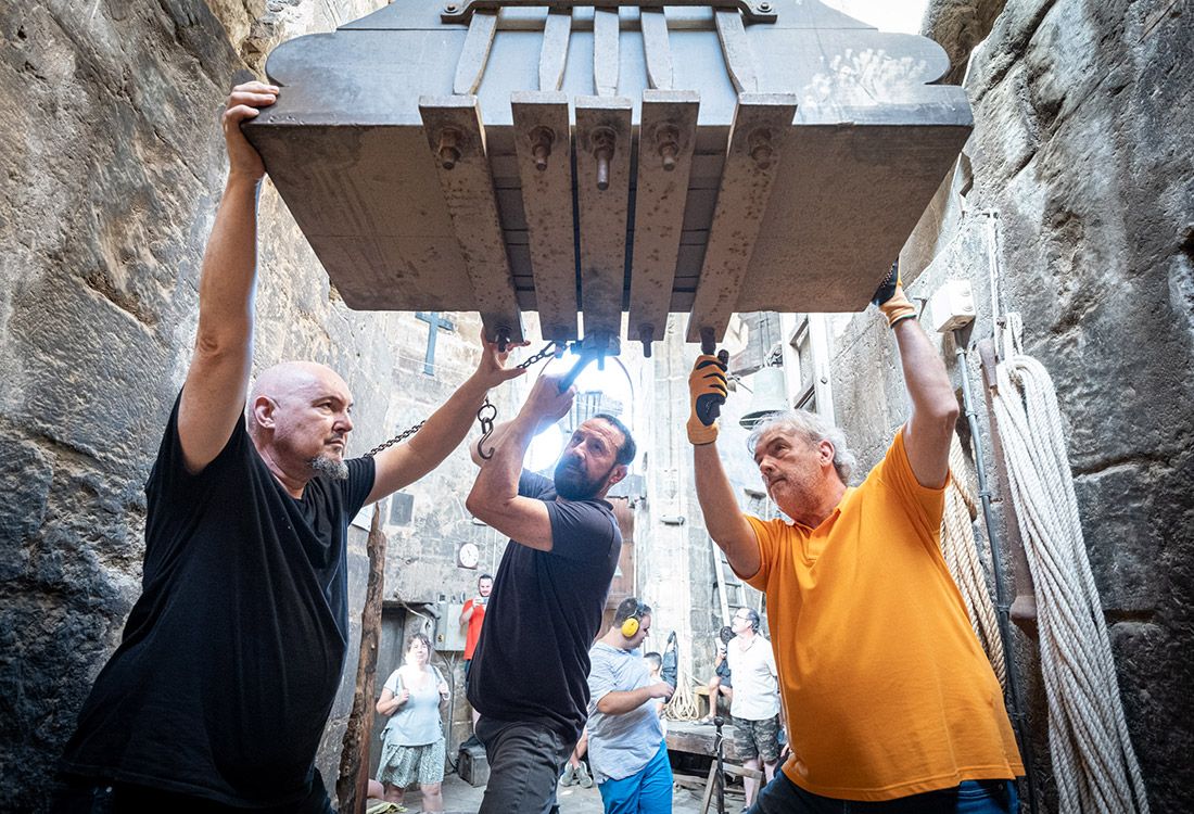 La tradición de apretar los tornillos de los yugos de madera de las campanas. Los campaneros de la Catedral de Valencia realizan este domingo, 10 de agosto, festividad de San Lorenzo, el tradicional “repret de les campanes” en la torre del Miguelete.