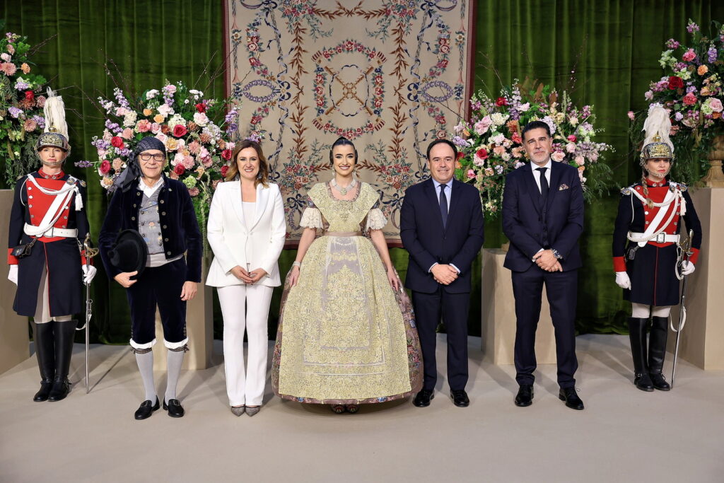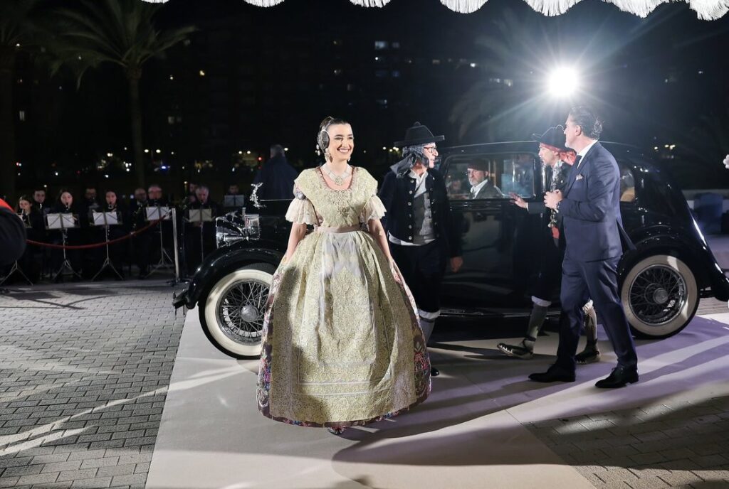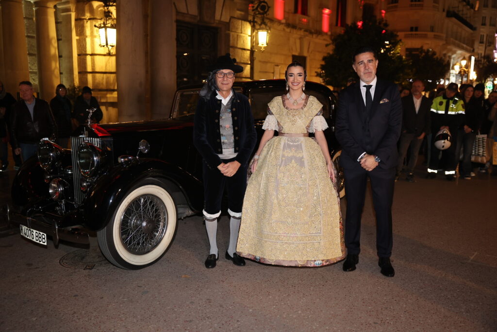 La llegada a la plaza del Ayuntamiento para subirse a los coches antiguos ha sido el momento de inicio del protocolo del acto de la exaltación 2026. Carmen se ha subido al vehículo con el mantenedor Boro Peiró y el presidente de Junta Central Fallera.