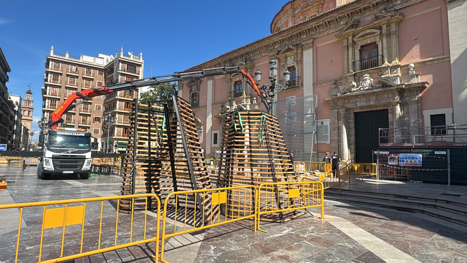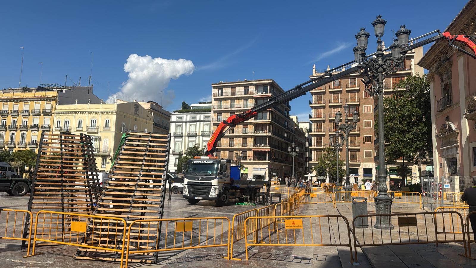 La Plaza de la Virgen de València ha comenzado ya a transformarse para uno de los actos más esperados de las Fallas. A falta de diez días para el inicio de la Ofrenda a la Virgen de los Desamparados, las primeras piezas del cadafal ya pueden verse instaladas en el centro de la plaza, donde se levantará la estructura que sostendrá el tradicional manto floral de la Mare de Déu.