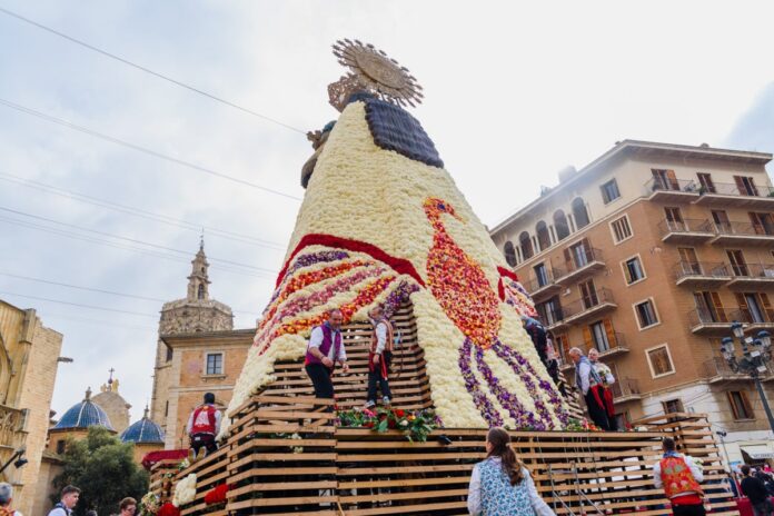Desde entonces, el cadafal vuelve a lucir con todo su esplendor cada mes de marzo en la plaza, donde miles de ramos de claveles volverán a cubrirlo para dar forma al manto floral de la Geperudeta, una de las imágenes más icónicas de las Fallas de València.