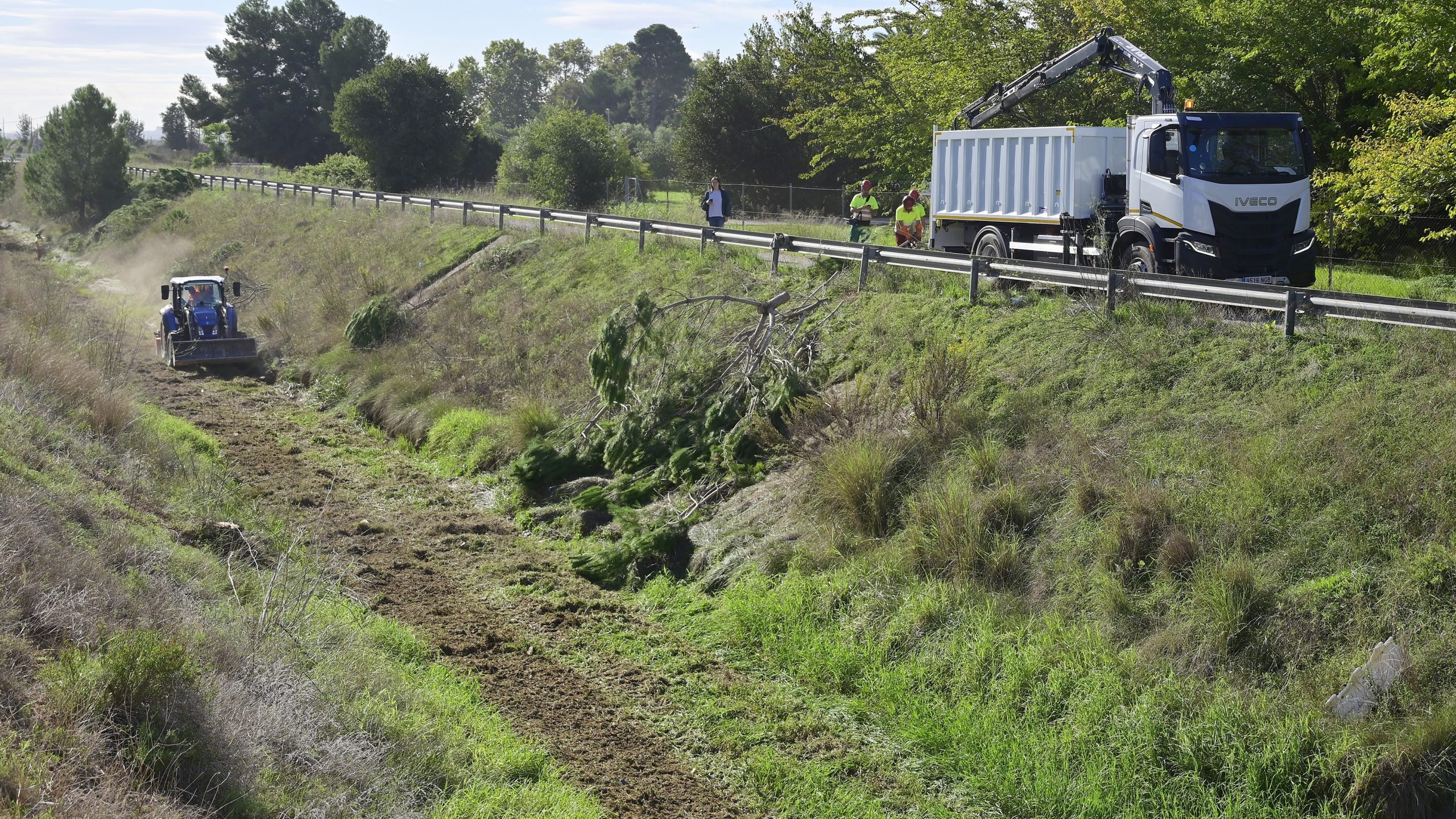 Por último, se actuará también junto al barranco ubicado junto al cementerio de Massarrojos. La tarea consistirá en la limpieza de la vegetación existente en el fondo del cauce mediante maquinaria agrícola equipada con trituradora mecánica. En esta zona trabaja un conductor y un tractor agrícola equipado con pala y trituradora mecánica.