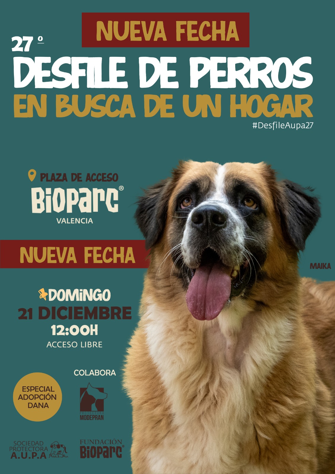 El esperado Desfile de Perros en busca de un hogar, organizado por la Fundación BIOPARC y la protectora Adopta Un Perro Abandonado (A.U.P.A.), no podrá celebrarse este fin de semana. La previsión de lluvias intensas y tormentas en Valencia, unida a la activación de la alerta naranja por parte de la Agencia Estatal de Meteorología (AEMET), ha obligado a posponer la convocatoria al domingo 21 de diciembre a las 12:00 horas.