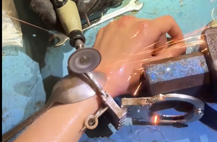 Los bomberos del Ayuntamiento de Valencia retiran unas esposas a una persona. Estas habían quedado atascadas. Los agentes tienen que hacer un trabajo fino, controlado y de máxima precisión para evitar cualquier daño.