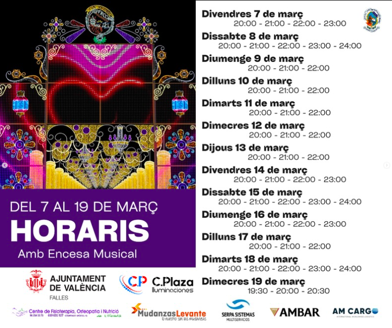El sábado 15 de marzo se prolongarán hasta las 00 horas, el 16 hasta las 23 horas, el 17 de marzo restará su intervalo de 20 a 22 horas mientras que el 18 de marzo estará hasta las 00 horas y el día de San José serán las últimas tres visualizaciones, que se llevarán a cabo de 19.30 a 20.30 horas.