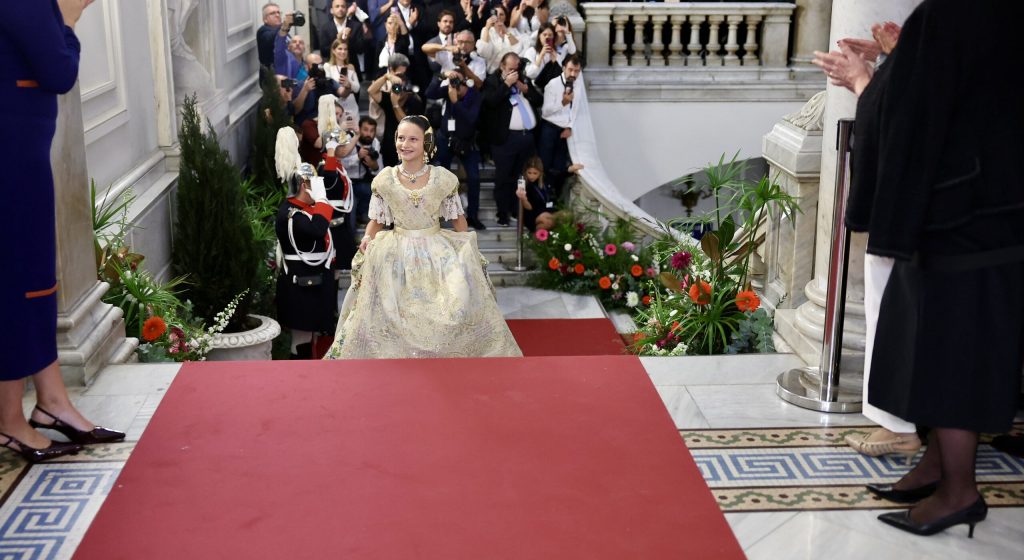 A las 19:00 horas, la alcaldesa de València, María José Catalá, junto al secretario general de Junta Central Fallera, Nico Garcés, y el concejal de Fallas y presidente de JCF, Santiago Ballester, recibieron a las protagonistas. Primero subieron las niñas de la Corte de Honor Infantil, radiantes de ilusión, seguidas por la Fallera Mayor Infantil, Marta Mercader, que ascendió sonriente, consciente de estar viviendo uno de los instantes más inolvidables de su vida.