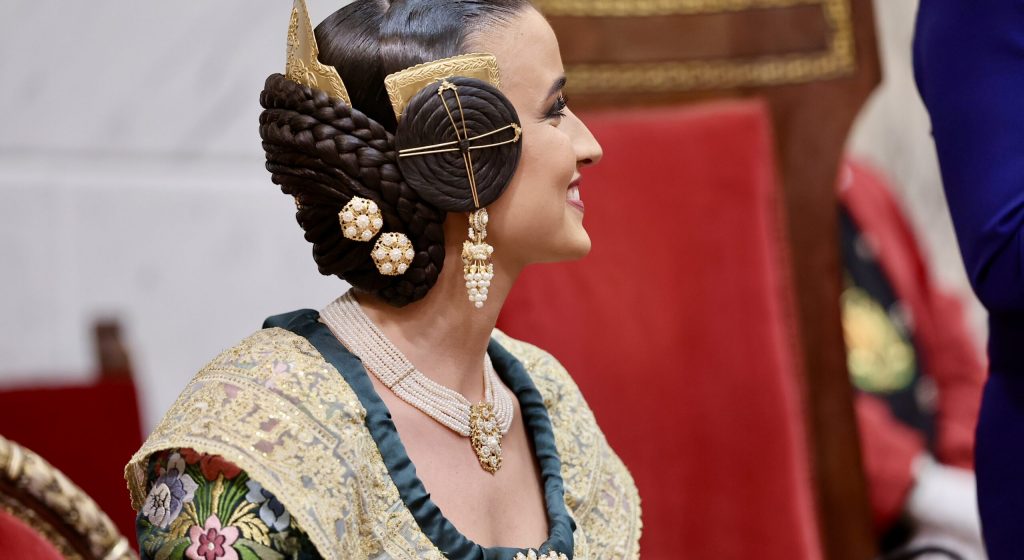 Más tarde, la Corte de Honor de la Fallera Mayor de València abrió paso a Carmen Prades, que subió con elegancia y serenidad, consciente de estar viviendo uno de los momentos más importantes de su vida. En el Salón de la Chimenea, ambas compartieron unos instantes de intimidad con la alcaldesa antes de dirigirse al Hemiciclo para el solemne acto de proclamación.