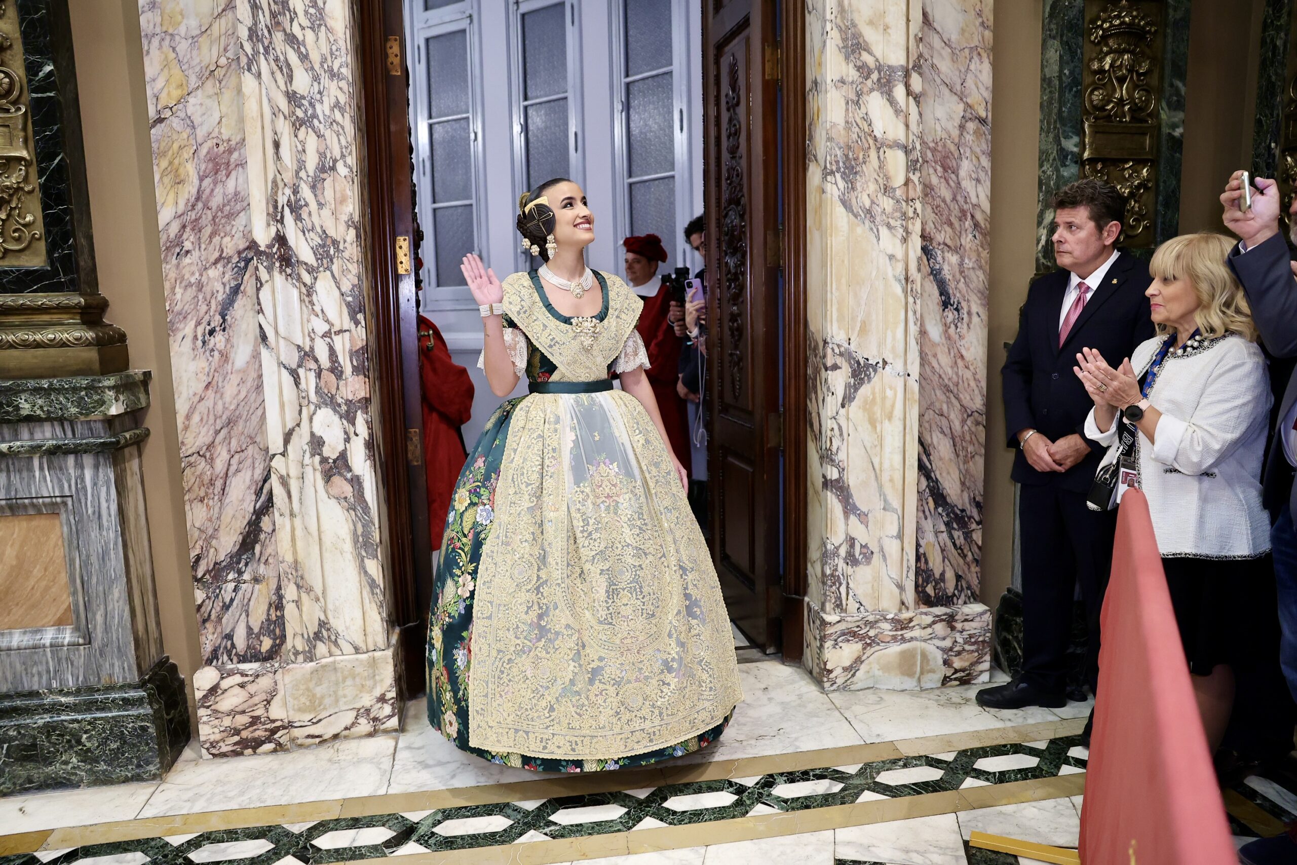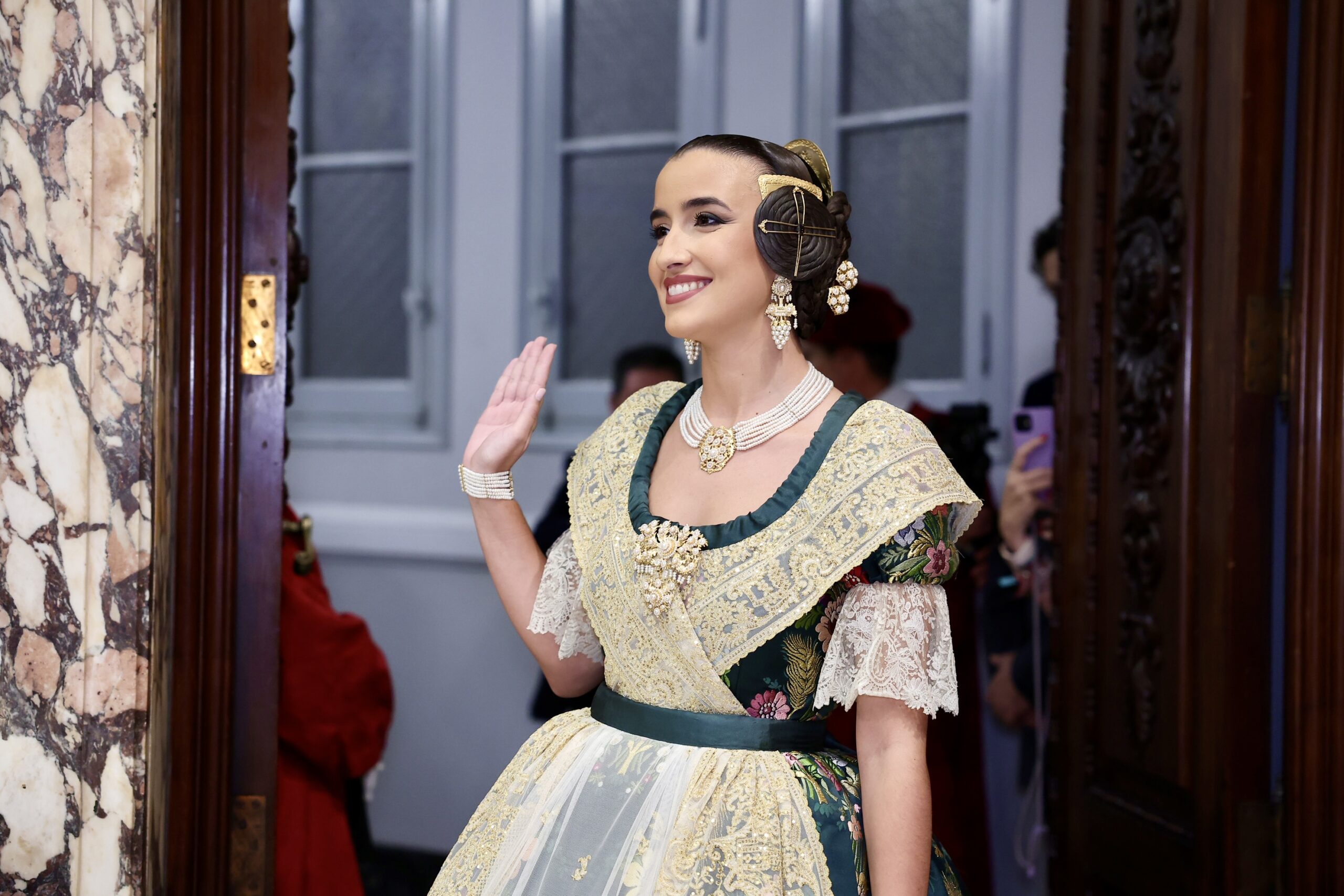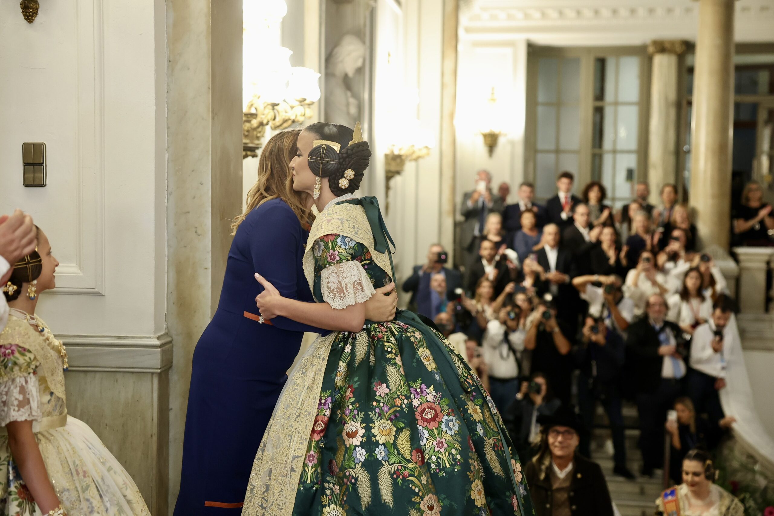 Más tarde, la Corte de Honor de la Fallera Mayor de València abrió paso a Carmen Prades, que subió con elegancia y serenidad, consciente de estar viviendo uno de los momentos más importantes de su vida. En el Salón de la Chimenea, ambas compartieron unos instantes de intimidad con la alcaldesa antes de dirigirse al Hemiciclo para el solemne acto de proclamación.
