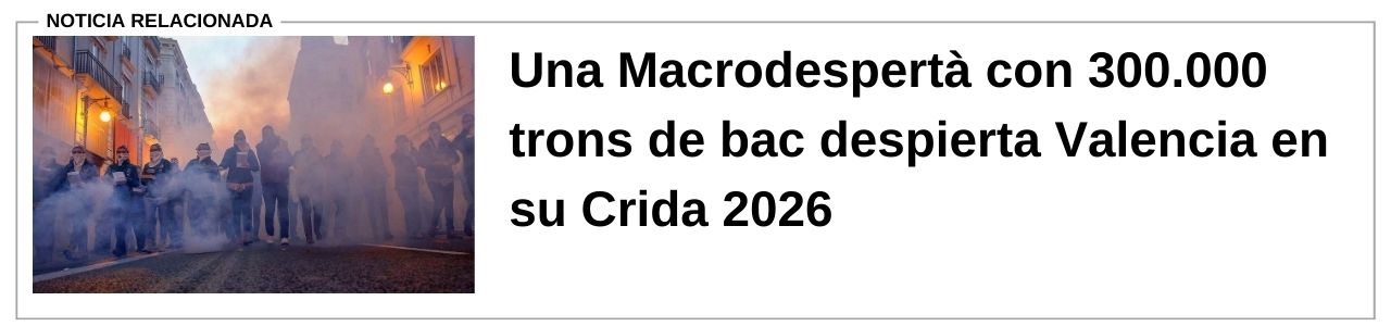 A las 07:30 horas ha arrancado la gran Macrodespertà, organizada por Junta Central Fallera, con miles de falleros participando en un recorrido sonoro que ha repartido cientos de miles de ‘tro de bac’. El punto culminante ha llegado a las 08:00 horas con el “Estruendo del Amanecer Valenciano”, un terremoto pirotécnico que ha hecho vibrar la plaza del Ayuntamiento y ha dado paso a un desayuno popular.