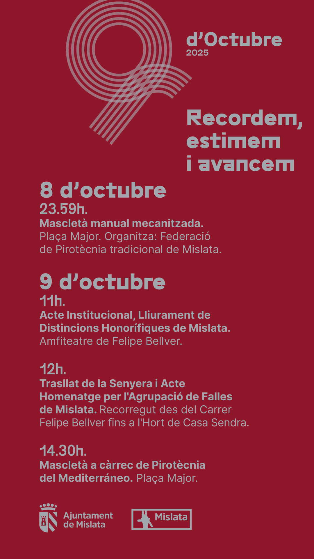 Con esta programación, Mislata reafirma su compromiso con las tradiciones y la cultura de la Comunitat Valenciana, invitando a todos sus vecinos a disfrutar de una jornada de unión y fiesta. El 9 d’Octubre volverá a llenar las calles de color, sonido y emoción, recordando la historia y la identidad que une a los mislateros con todo el pueblo valenciano.
