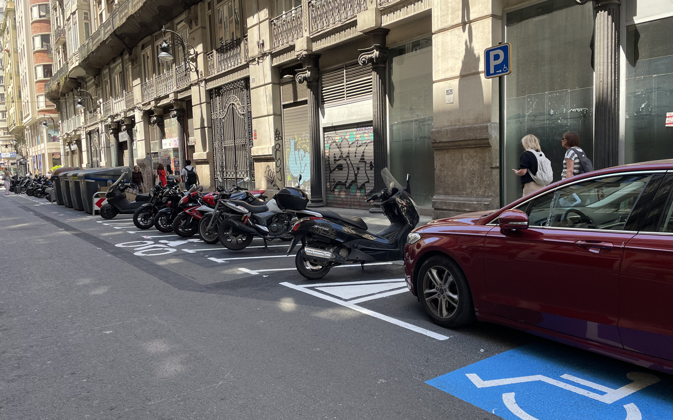 Nueva zona de estacionamiento de motos en el centro de Valencia. El Servicio de Movilidad ha habilitado 50 plazas de estacionamiento para motocicletas en la calle Les Garrigues. En este mismo espacio delimitado para el aparcamiento, también ha señalizado cuatro plazas para carga y descarga. Estas serán compatibles con la zona naranja, según los horarios estipulados para cada uso.