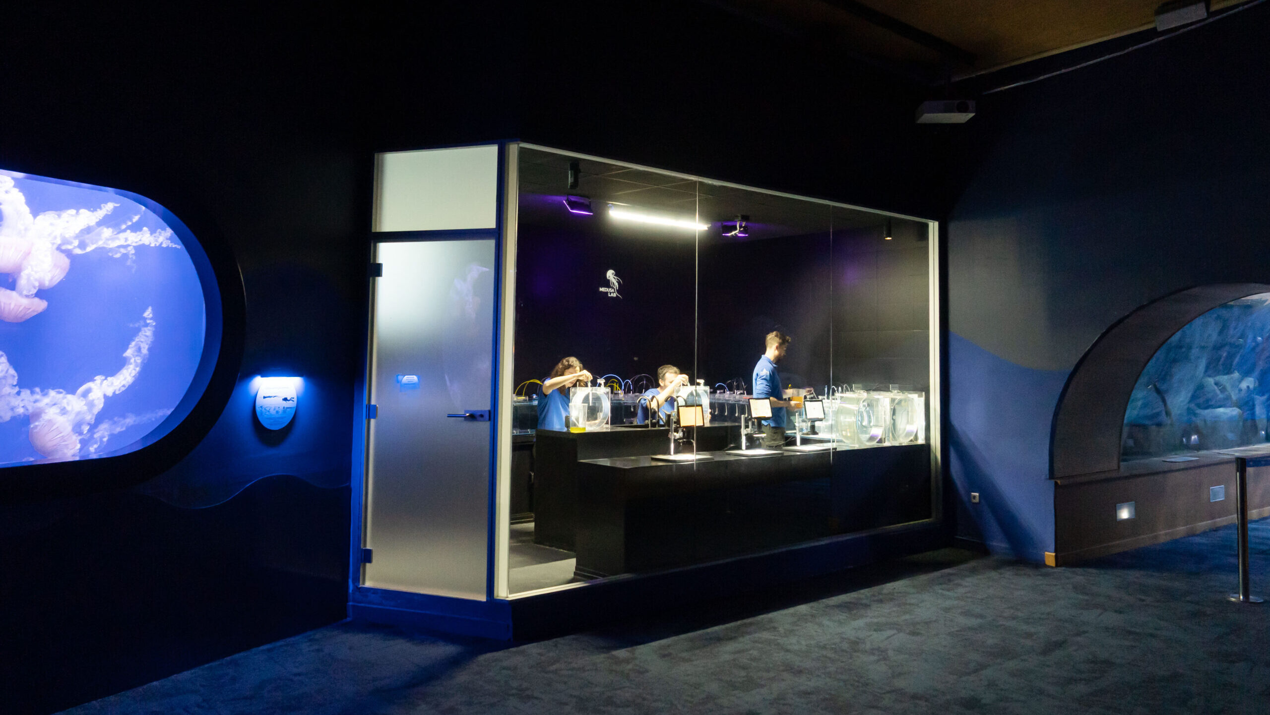 El visitante puede observar el trabajo a través de ventanales y dispositivos de aumento, como microscopios. De este modo, se visibiliza el trabajo diario del equipo de biólogos y acuaristas especializados en medusas, responsables de supervisar el estado de los cultivos, ajustar parámetros, alimentar a los organismos y planificar los traslados a acuarios auxiliares.