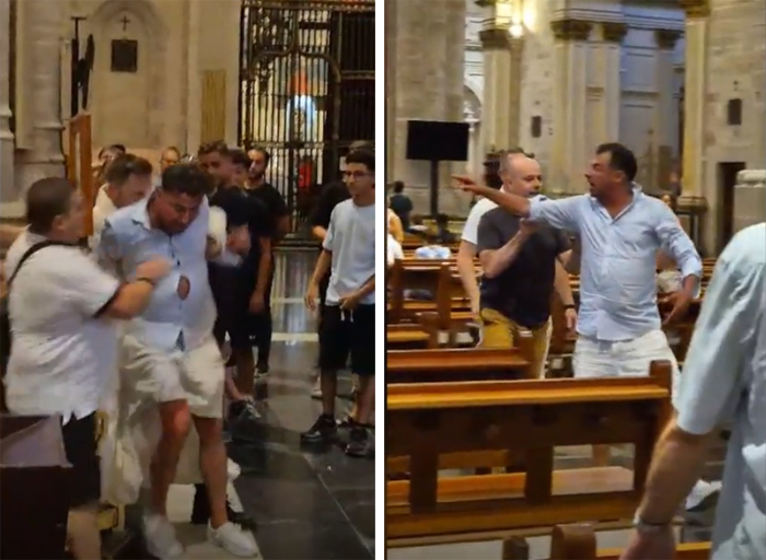 Pelea dentro de la Catedral con un hombre gritando que sale a patadas del templo. Según ha publicado el diario Levante los hechos se produjeron en la misa del pasado jueves. Todo apunta a que un hombre se quedó dormido durante la celebración de la misa y el sacristán lo despertó y le invitó a salir del templo por respeto. Según puede verse en el vídeo el hombre estaba bebido y no era el lugar adecuado.