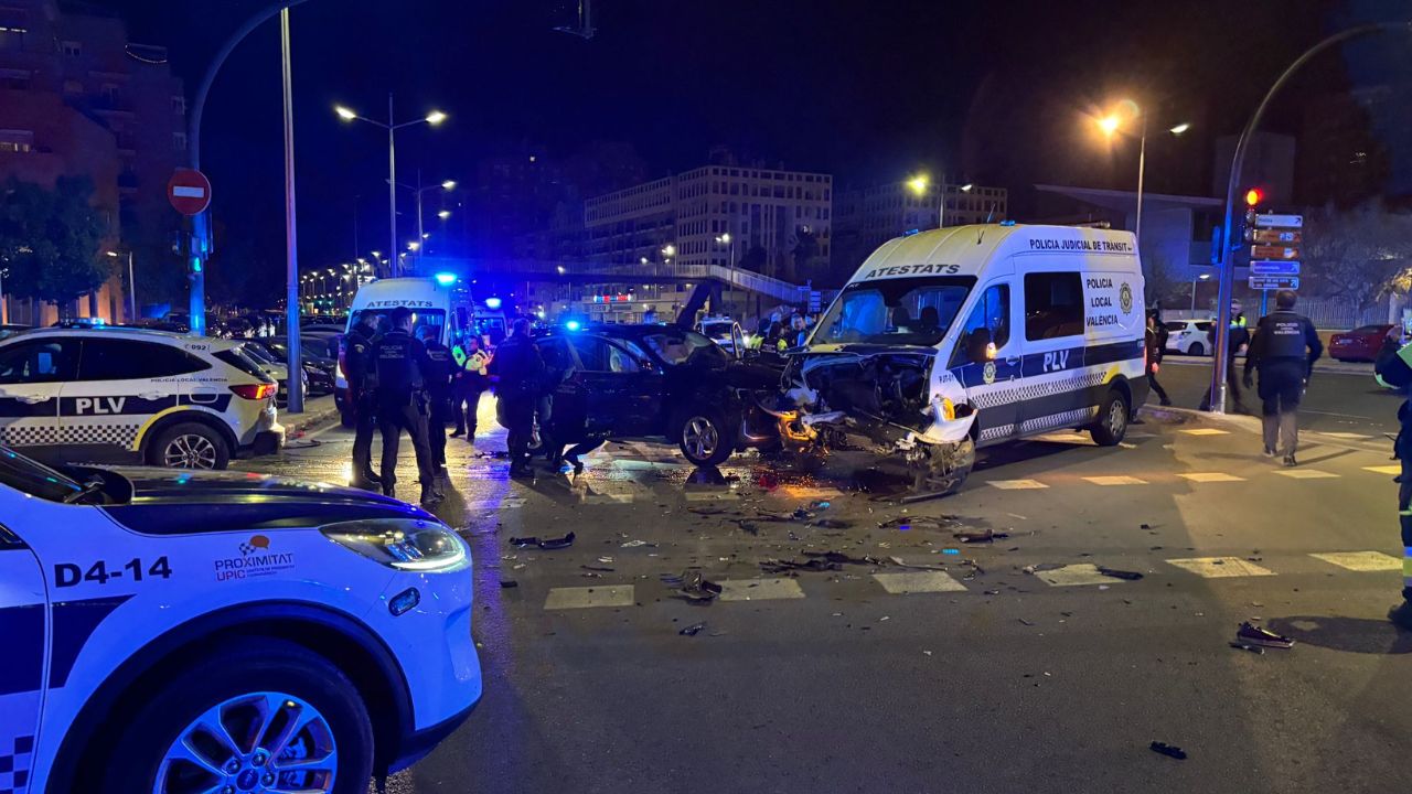 El vehículo, un BMW X1 con la matrícula manipulada, recorrió varias calles, incluyendo Jacinto Benavente e Instituto Obrero, y llegó a embestir un coche policial en el puente de Monteolivete. Para interceptarlos, la policía estableció un control en la intersección de las avenidas Ausiàs March y Antonio Ferrandis, donde el BMW perdió el control e impactó violentamente contra un furgón de la Unidad de Policía Judicial de Tráfico. En ese momento no había agentes dentro del vehículo policial.