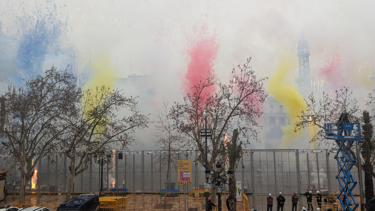 El cuerpo central del disparo ha contado con cinco fases de truenos terrestres, acompañadas de efectos de color y truenos aéreos que han envuelto toda la plaza en un estruendo vibrante. Finalmente, el espectáculo ha culminado con un terremoto final en cuatro fases, un bombardeo aéreo y un cierre de truenos atronador que ha hecho temblar el corazón de Valencia.