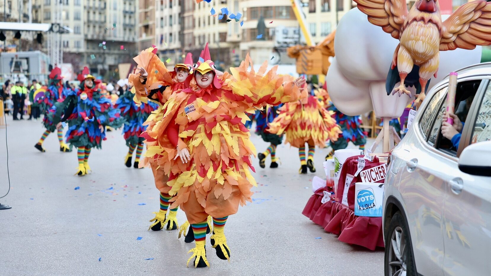 El desfile recorre algunas de las principales calles del corazón de la ciudad con carrozas, disfraces, música y una fuerte carga de crítica social y política. Las comisiones falleras sacan a la calle su ingenio en un espectáculo donde el humor y la creatividad son protagonistas, culminando con la entrada de las primeras piezas de la Falla Municipal, uno de los momentos más esperados del acto.