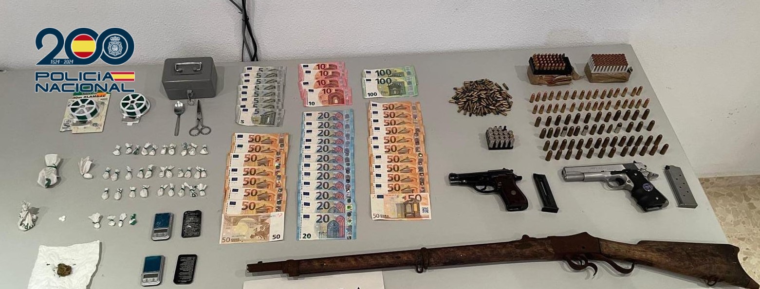 La investigación culminó con dos registros domiciliarios. Se incautaron 46 gramos de cocaína, más de un kilo en cogollos de marihuana, 740 euros en metálico, tres armas de fuego y numerosa munición de diferente calibre.