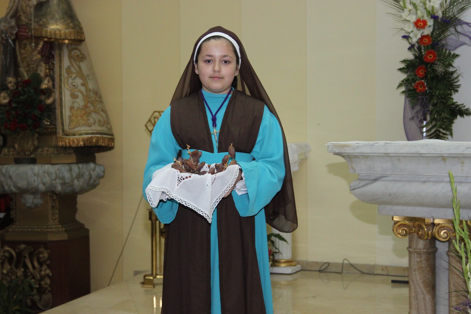 -Marta de Betania: En una bandeja unas llaves o en una cesta productos propios de Palestina, como dátiles o higos.