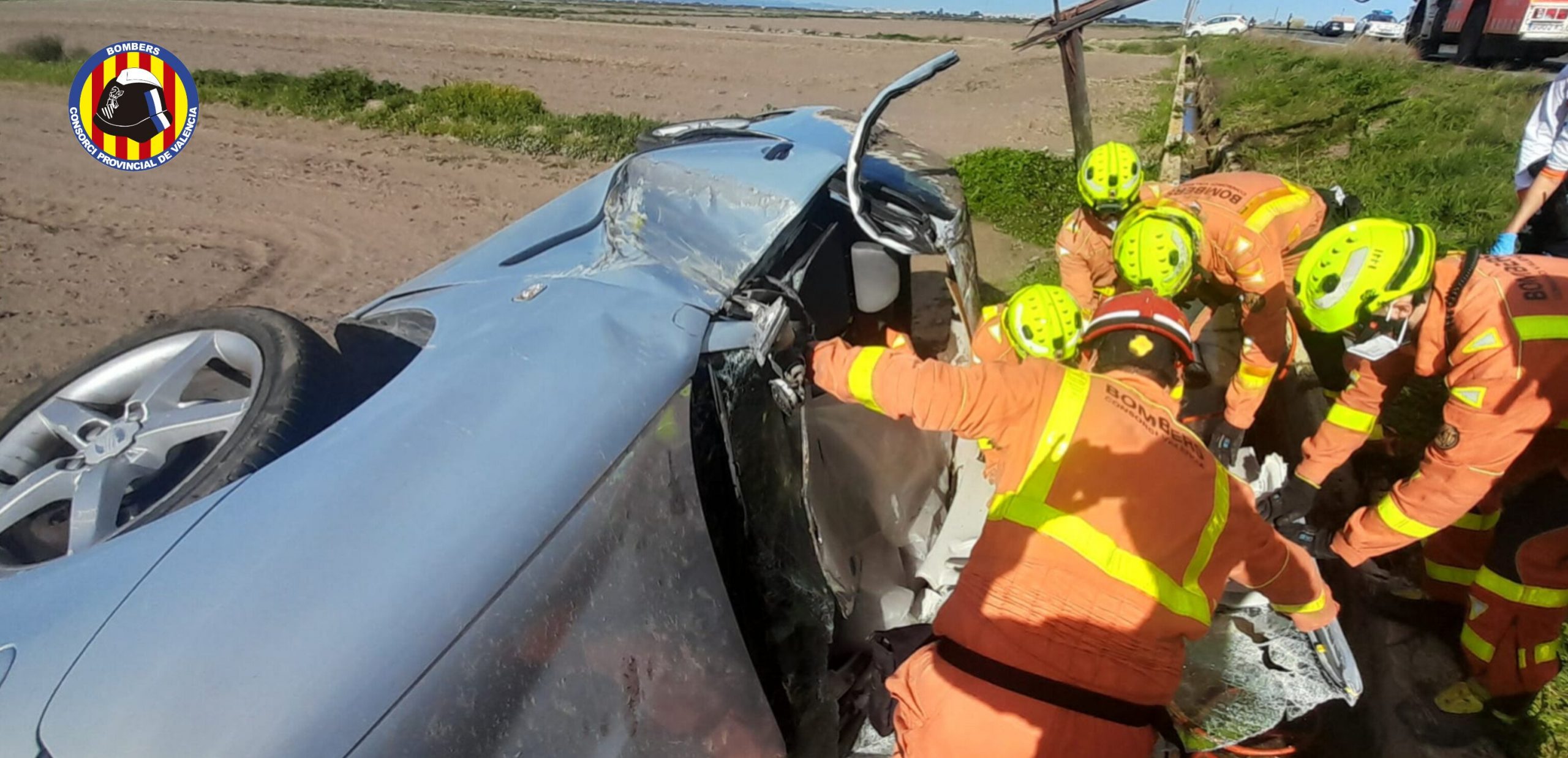 Los bomberos rescatan a dos personas tras un accidente múltiple en l`Albufera de Sueca, en la CV-500. Tres vehículos se han visto involucrados según ha informado el Consorcio Provincial de Bomberos de Valencia.