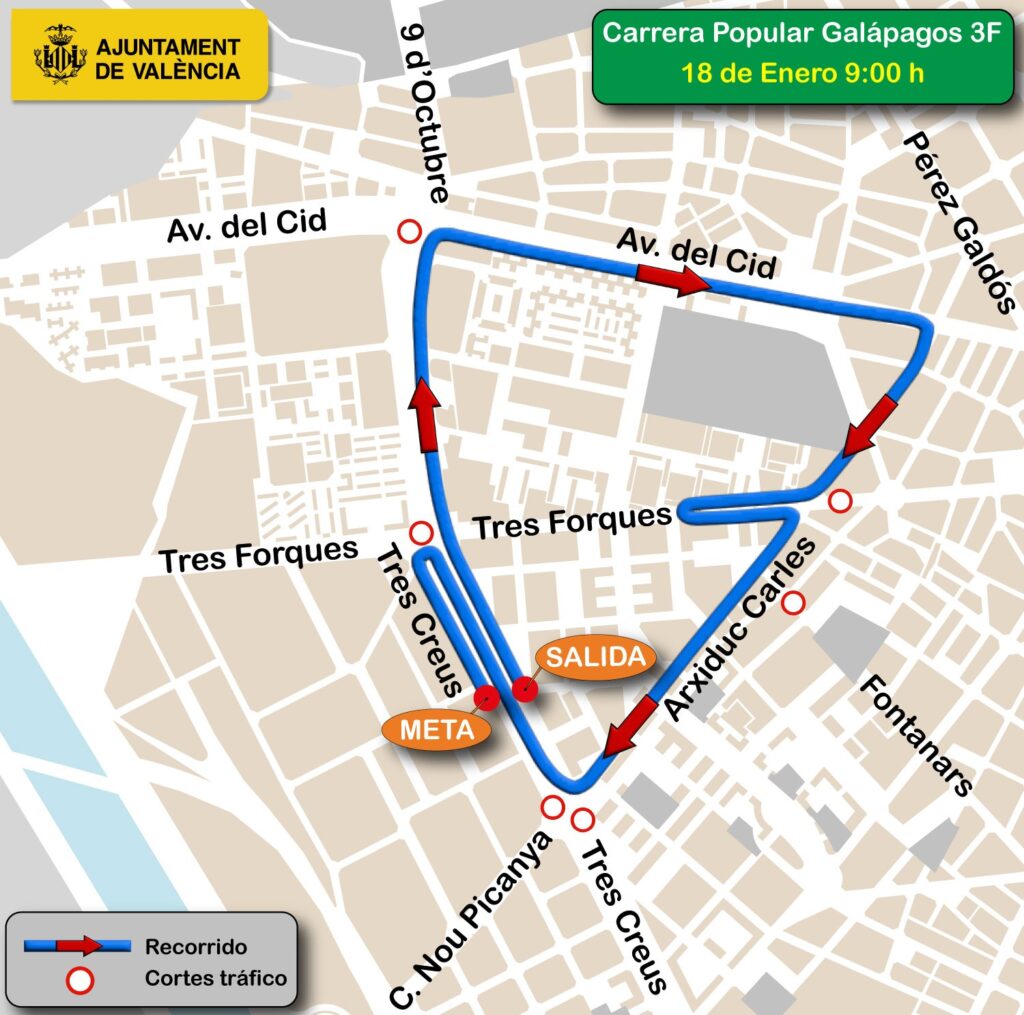 La XXVII Carrera Popular Galápagos 3F recorrerá los barrios de Tres Forques y Vara de Quart este domingo. Con motivo de la prueba, primera del circuito de carreras Caixa Popular Ciutat de València 2026, habrá calles cortadas y cambios en las rutas de la EMT.