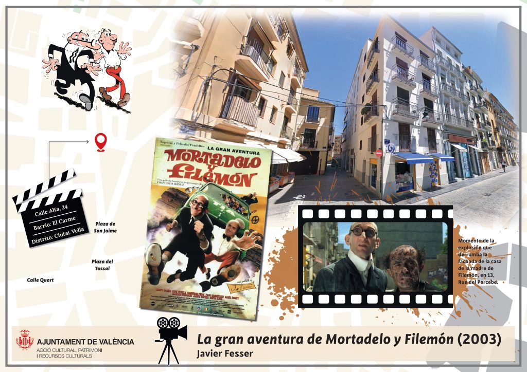 En el barrio del Carmen podemos disfrutar de las aventuras de «Mortadelo y Filemón». Un film cómico español dirigido por Javier Fesser y protagonizada por Pepe Viyuela. Está rodada en la calle Alta. A pocos metros, en la plaza de la Virgen y de la Reina se grabó la película «Un negre amb un saxo», está basada en una novela de Ferran Torrent, es un retrato sarcástico de la sociedad valenciana de los años ochenta.