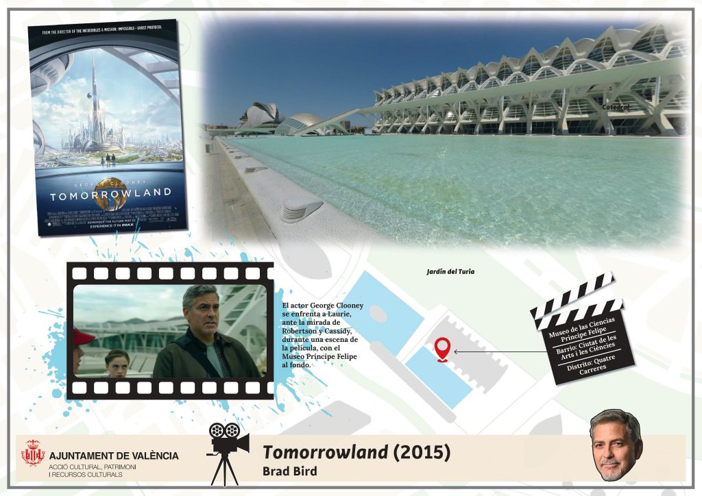 Valencia tiene una ruta cinematográfica que nos acerca la ciudad a películas clásicas y contemporáneas, algunas internacionales. La Ciudad de las Artes y las Ciencias ha sido el escenario elegido por grandes producciones. Destaca la película «Tomorrowland» protagonizada por George Clooney que recrea un ficción muy aventurera. En este escenario también se ha grabado «Doctor Who», «Andor», «Westworld» y «París Tumbuctú».