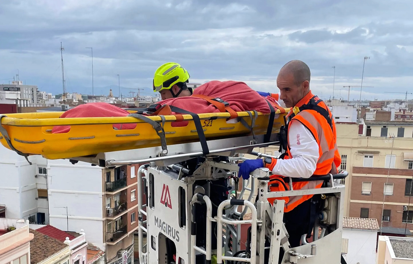 Los agentes no tenía otra opción para sacar a la octogenaria de su vivienda situada en la sexta planta de un edificio residencial. Tras la valoración conjunta con el SAMU, se decidió realizar la evacuación mediante vehículo de altura, utilizando la autoscalera AEA-32-1, efectuando el descenso desde la terraza del edificio hasta la vía pública.