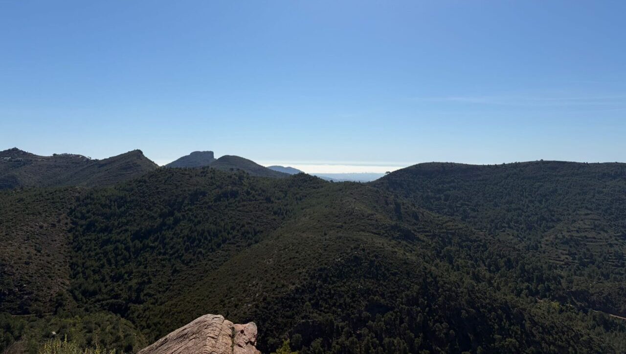 Desde la cima, las vistas se abren hacia el conjunto de la sierra y el valle, e incluso permiten divisar el mar en días despejados. Este punto se convierte en un lugar habitual para detenerse y disfrutar del entorno antes de iniciar el descenso.