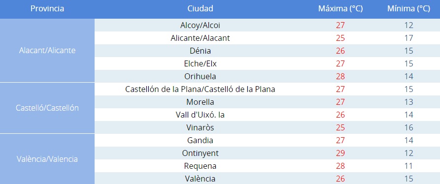 Bones notícies en l’apartat meteorològic. El bon temps serà la tònica dominant en la Comunitat Valenciana durant el cap de setmana, amb cel buidat i temperatures mínimes en ascens, segons informa l’Agència Estatal de Meteorologia (Aemet). A València el termòmetre podria aconseguir els 27 graus durant la jornada del diumenge.