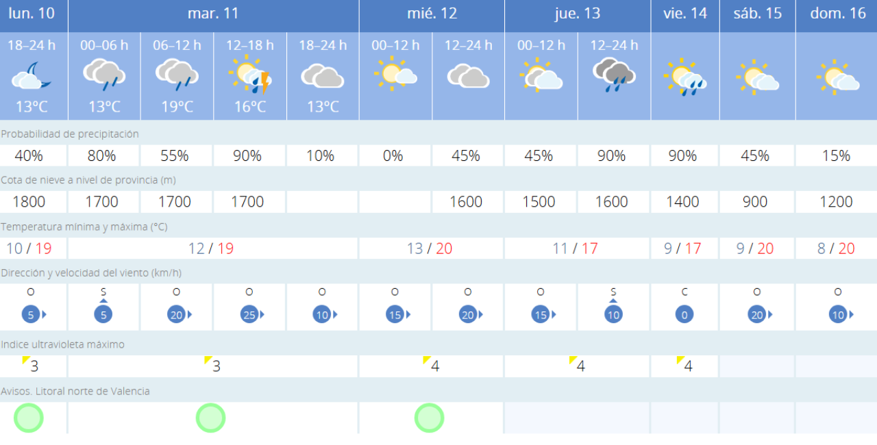 Cielo nuboso con precipitaciones, sin descartar que sean localmente fuertes o persistentes. La cota de nieve podría descender hasta los 900-1200 m a últimas horas en el interior. Temperaturas mínimas en ligero descenso; máximas en descenso en el tercio norte y con pocos cambios en el resto. Posibles heladas débiles en el interior norte. Viento del suroeste en el litoral de Alicante y flojo con predominio de la componente oeste en el resto, tendiendo a noroeste moderado la segunda mitad del día, sin descartar rachas muy fuertes en el interior norte de Castellón a últimas horas.