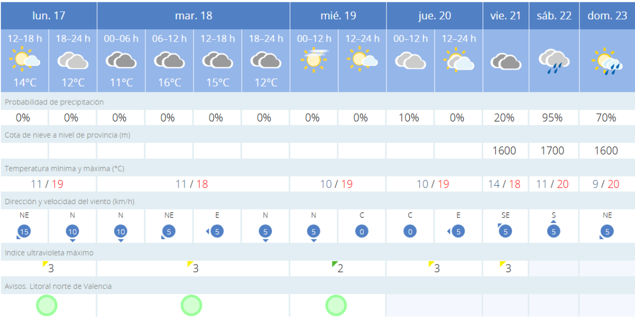 Intervalos de nubes bajas en el litoral, disminuyendo a poco nuboso en el sur de Alicante por la tarde. En el interior, cielo poco nuboso con nubosidad de evolución diurna por la tarde. Posibles bancos de niebla por la mañana en el interior de la mitad sur. Temperaturas con pocos cambios volviendo a registrarse máximas de 20º. Viento flojo variable, con intervalos de nordeste moderado a primeras horas en el litoral; tendiendo en general a viento flojo del este por la tarde.