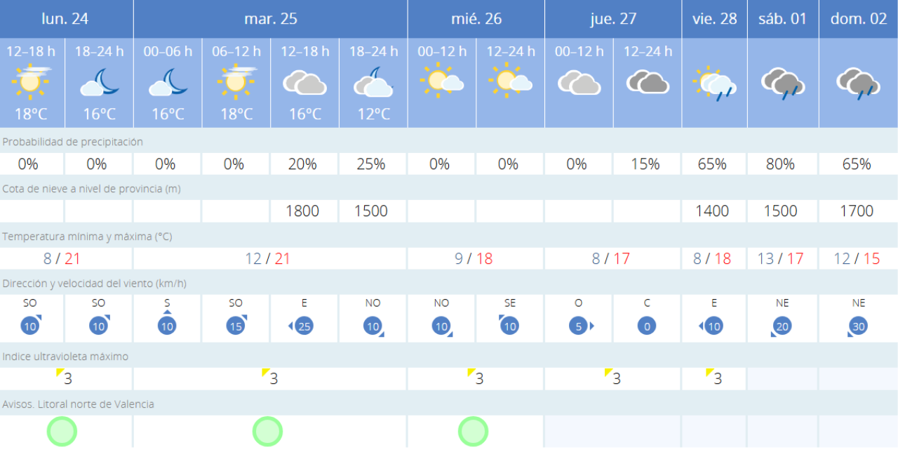 Cielo poco nuboso, aumentando a intervalos nubosos o cielo nuboso a partir del mediodía. Posibles precipitaciones débiles en el litoral y prelitoral la segunda mitad del día. Temperaturas mínimas en ascenso hasta los 5º en el interior y los 12º en el litoral; máximas en descenso en la mitad sur y sin cambios en el resto manteniéndose en 21º en la ciudad de Valencia. Viento del oeste, disminuyendo a flojo por la tarde y con intervalos de nordeste en el litoral.