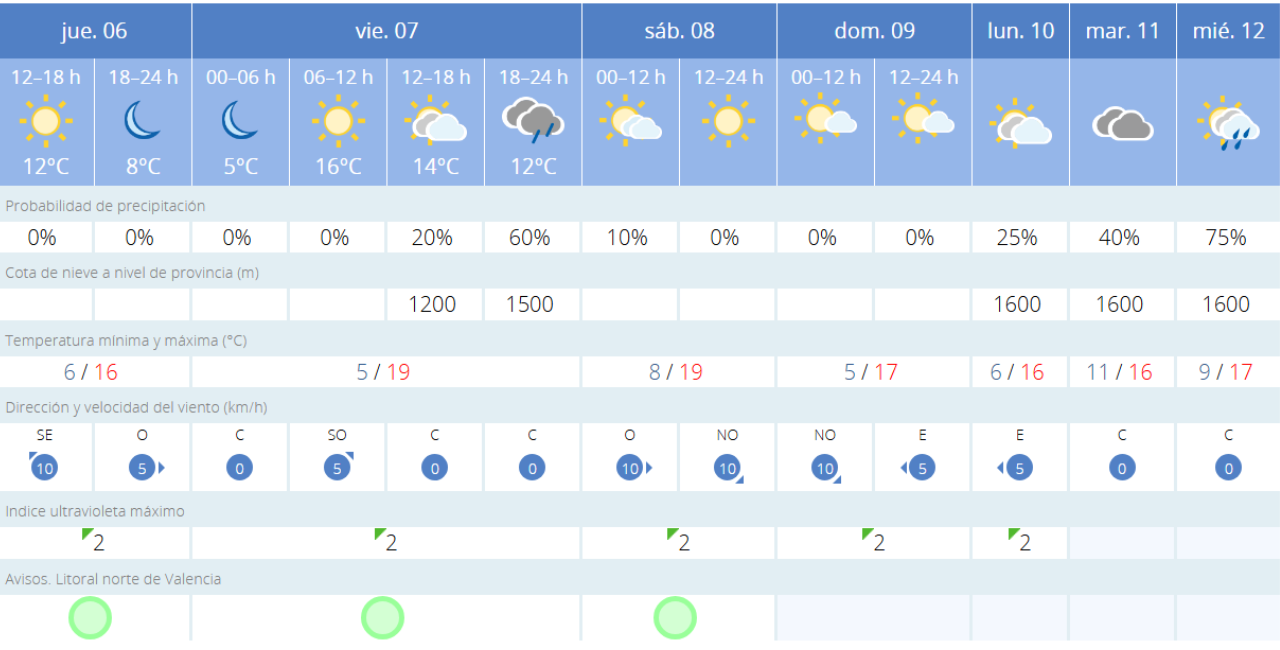 Cielo poco nuboso con nubes altas, aumentando a cielo nuboso por la tarde. Probables precipitaciones débiles y dispersas la segunda mitad del día. Descenso de los mercurios con temperaturas mínimas de -2º en poblaciones del interior norte de Valencia y 5º en el litoral. Por el contrario, suben las máximas llegando a los 19º. Heladas débiles en el interior. Viento flojo variable, tendiendo por la tarde a sur y suroeste moderado en el litoral y a predominar la componente oeste en el interior.