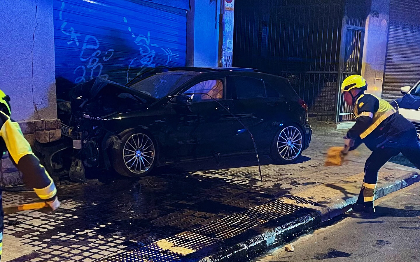 Un coche se empotra contra una planta baja en la avenida Constitución de Valencia. Los bomberos del Ayuntamiento de Valencia han intervenido tras una colisión frontal a las 4 de la madrugada. El accidente ha provocado un derrame de aceite y líquido refrigerante en la calzada.