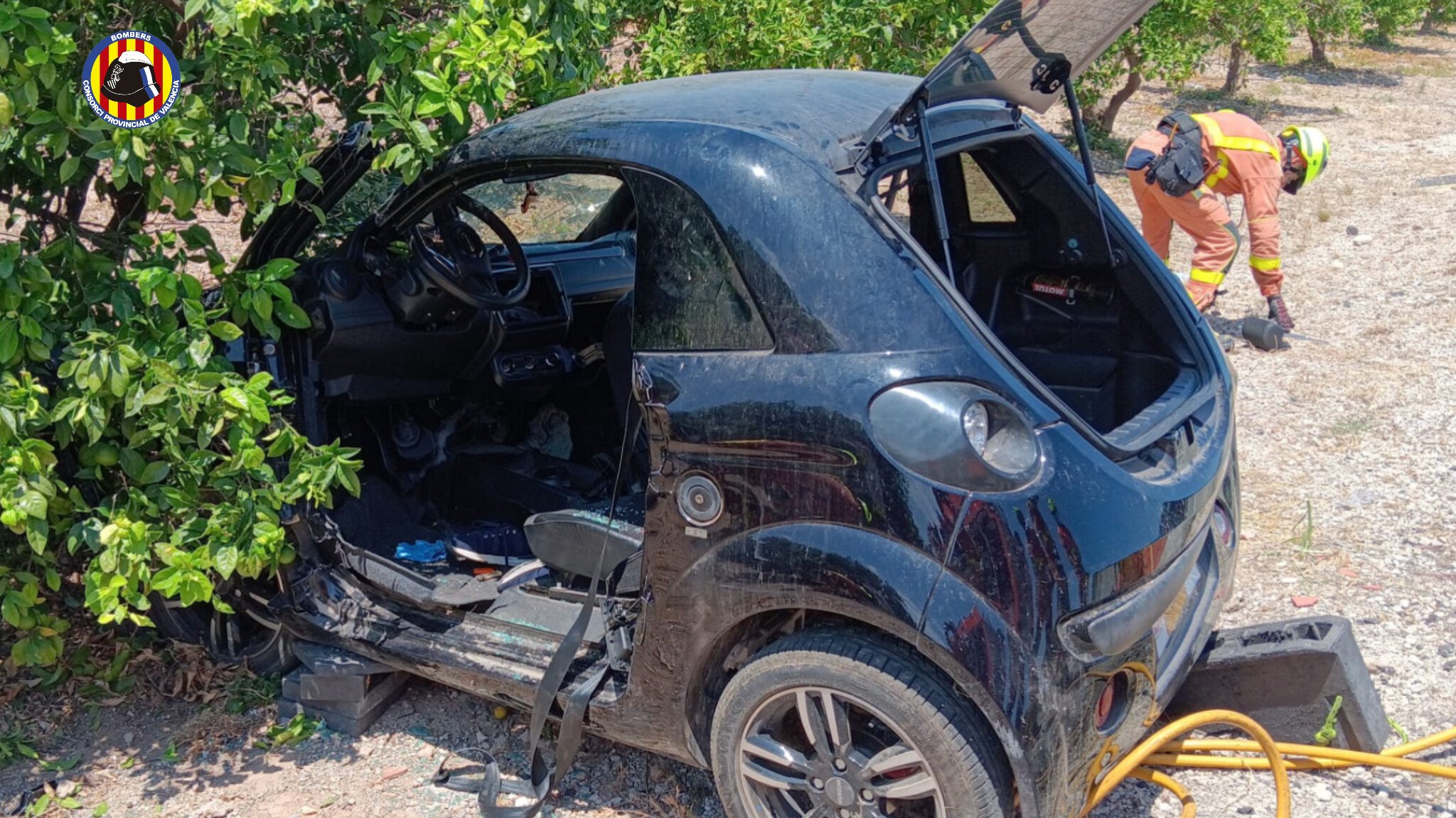 Los Bomberos del Consorcio Provincial de Valencia han rescatado a un conductor que choca contra un árbol en la Font d’en Carròs. El vehículo se ha salido de la vía y ha entrado en un campo, quedando el conductor atrapado en el interior del coche.