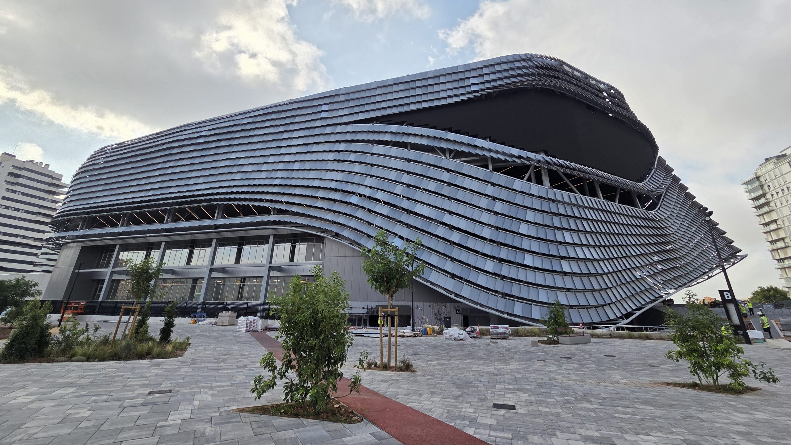 El diseño arquitectónico, a cargo de los estudios HOK y ERRE, destaca por su innovación y sostenibilidad. La fachada cuenta con 8.600 lamas cerámicas que regulan la luz solar y una estructura envolvente de tres terrazas y 4.000 m², con soluciones de ingeniería que permiten voladizos de hasta 12,5 metros. En el interior, el recinto estará equipado con pantallas LED de gran formato, como “El Ojo”, de 300m², o un marcador central de 250m², ofreciendo una experiencia visual inmersiva.
