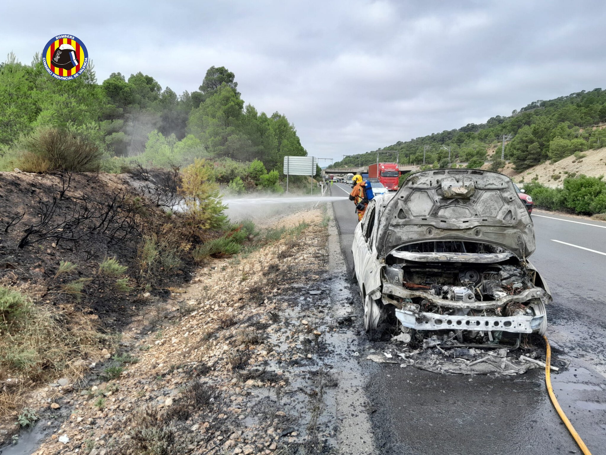 Un vehículo arde en la carretera A-35 cerca de Vallada tras salirse de la vía. Los bomberos del Consorcio de Valencia han intervenido para apagar el fuego junto a unos matorrales. Hasta la zona se han acercado dotaciones de Xàtiva y voluntarios de Vallada.