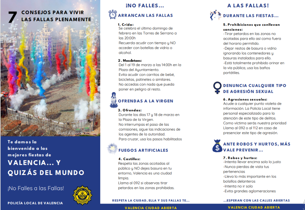 Bajo el lema es ‘No falles a las Fallas’, el tríptico está disponible de manera digital en la web del consistorio, con un QR enlazado para su descarga, y en las redes sociales municipales. Además, se ha elaborado en castellano, valenciano e inglés para llegar a todos los ciudadanos que visiten Valencia.