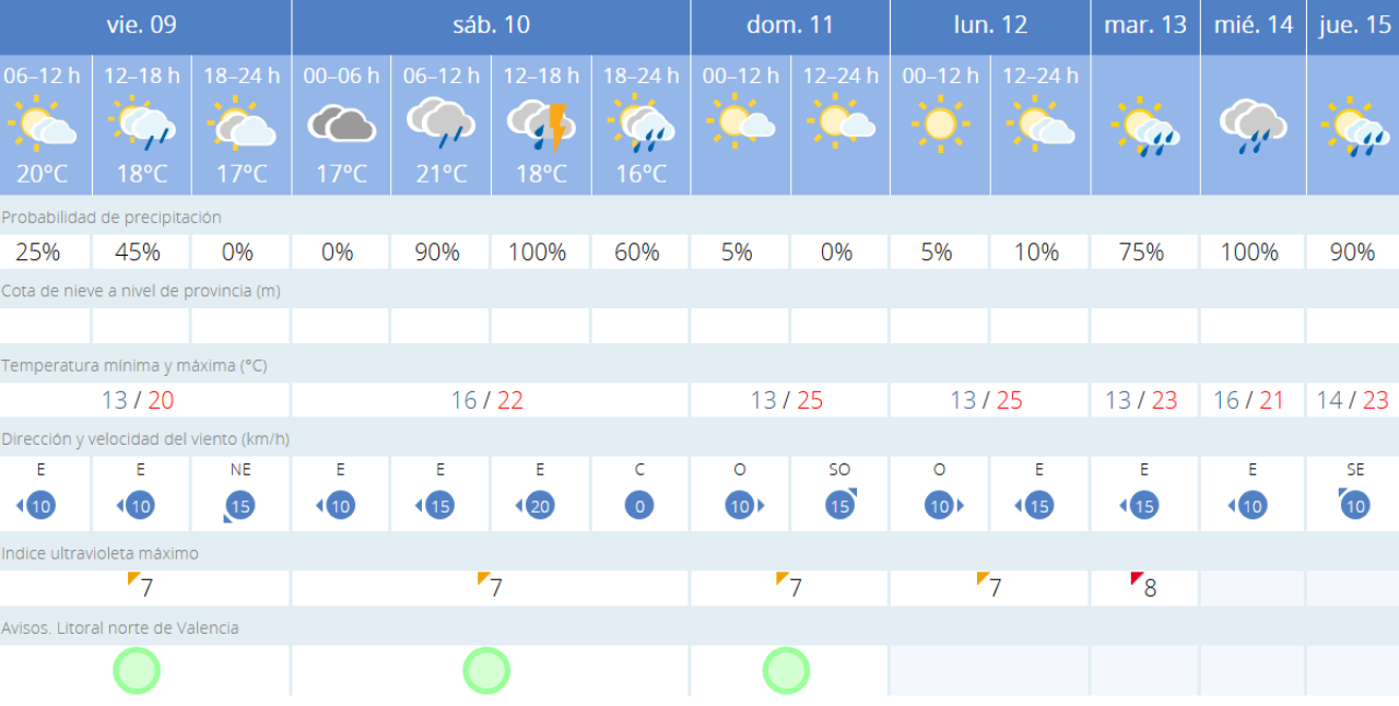 Para el domingo, Aemet mantiene un pronóstico similar, con intervalos nubosos y probabilidad de chubascos con tormenta en el interior norte y posibilidad de precipitaciones dispersas en otras áreas de la Comunitat. Se espera un ligero ascenso de las temperaturas máximas llegando hasta los 25º, con viento flojo de componente oeste y brisas en zonas costeras durante las horas centrales.