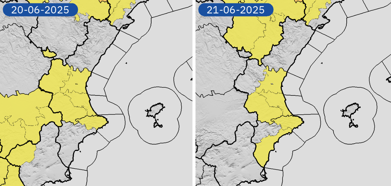 La previsión de AEMET es reactivar la alerta amarilla por altas temperaturas en el litoral de Valencia y norte de Alicante. A diferencia del viernes, en esta ocasión también entrará en nivel de riesgo por calor extremo tanto el interior sur de Valencia como el sur de la provincia de Alicante.
