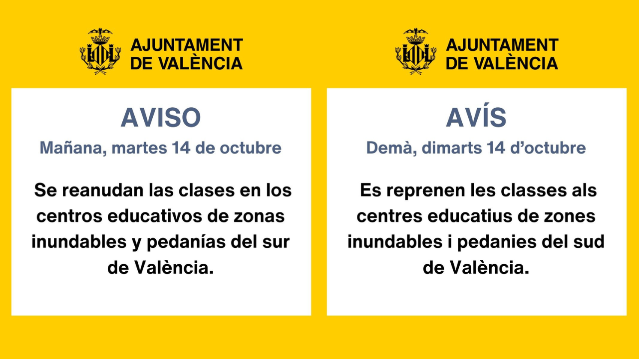 Con el cese del riesgo extremo, Valencia capital y localidades como Paterna, Mislata o Cullera han decidido levantar las restricciones, permitiendo la reapertura de centros educativos, parques y espacios deportivos. La UV también ha confirmado la vuelta a la actividad académica, aunque seguirá eximiendo de asistencia al alumnado que resida en zonas aún afectadas por el temporal.